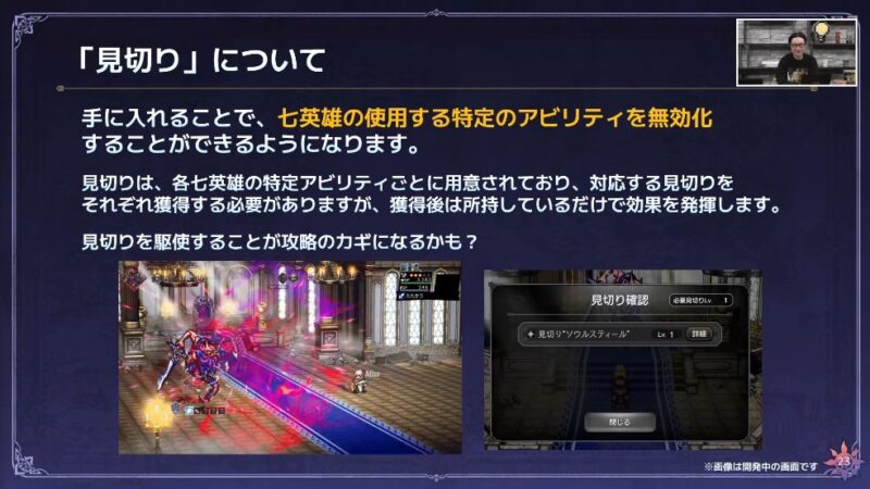 「見切り」は所持しておくだけで、七英雄の特定のアビリティを無効化できるので、このバトルにおいては、かなり重要になってきそうです