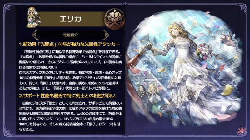 そして必殺は前衛全体に威力アップ75%(2ターン)、HPバリア、獅子状態を付与可能(獅子は後衛にも)。自身と味方剣士の火力を大幅に上げることができそうです