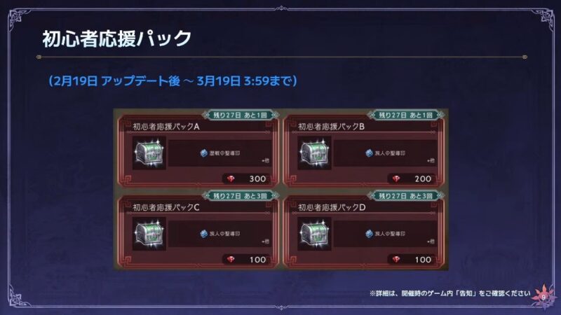 ルビーを消費して購入できる「初心者応援パック」が登場します