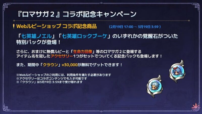 クラウンは「七英雄バトル」や「ロマサガコラボ討伐依頼」、「Webルビーショップ」で入手可能。