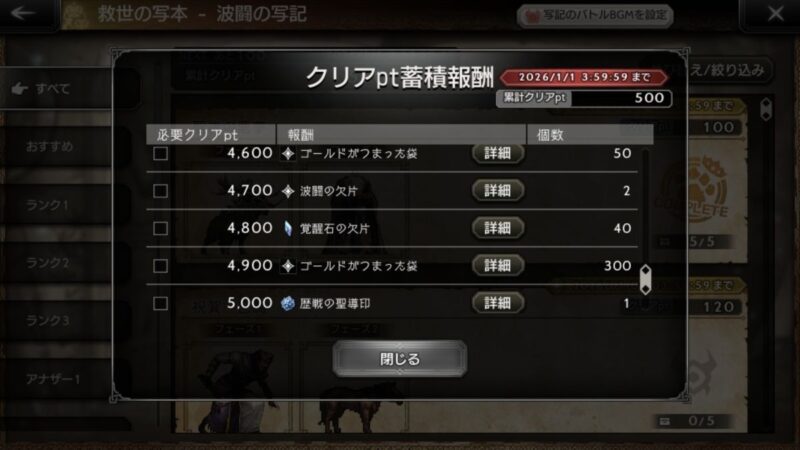 蓄積ptはどのステージを周回しても溜まっていくので、ちょっと頑張って5000ptまで溜めましょう