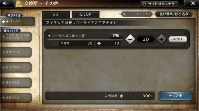 「ゴールドがつまった袋」→「ゴールド」への交換は、「欠片入手」で行えます