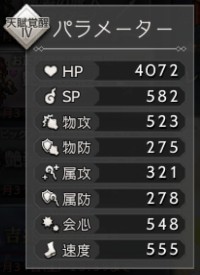 ステータスは、基本的にHP/SPや攻撃力が大事。キャラの素の攻撃力は、武器の攻撃力よりも大きくダメージに影響します