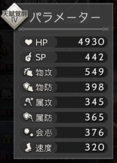 ステータスは、基本的にHP/SPや攻撃力が大事。キャラの素の攻撃力は、武器の攻撃力よりも大きくダメージに影響します