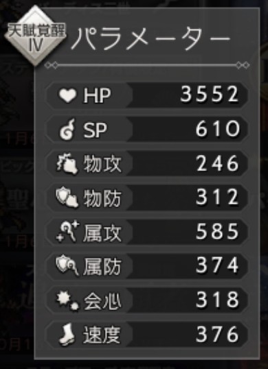 ステータスは、基本的にHP/SPや攻撃力が大事。キャラの素の攻撃力は、武器の攻撃力よりも大きくダメージに影響します