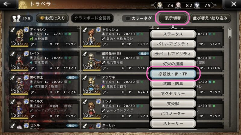 「表示切替」→「必殺技・jP・TP」を選択します