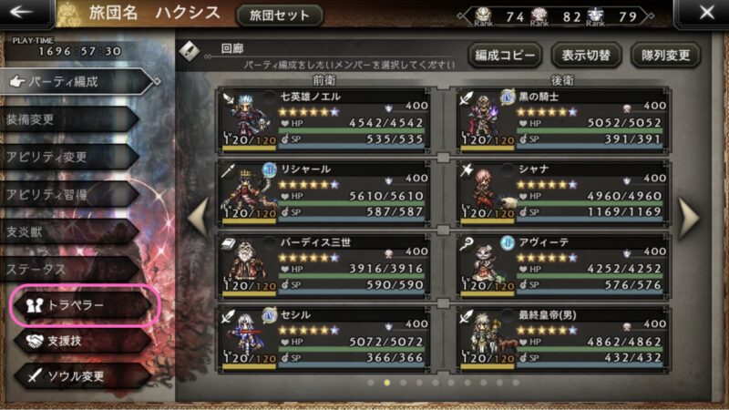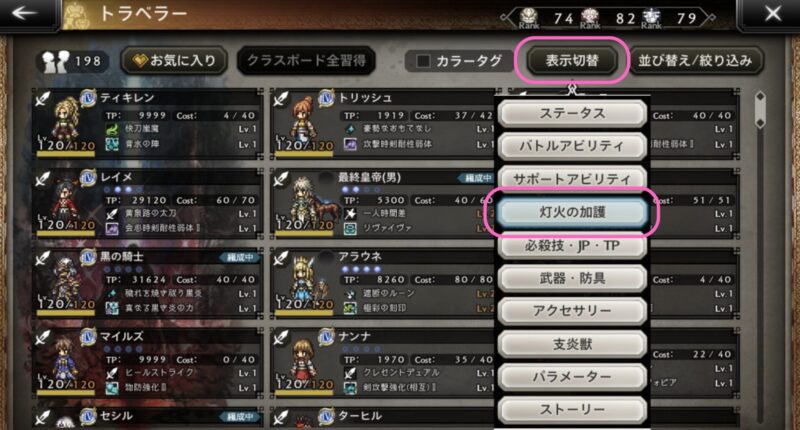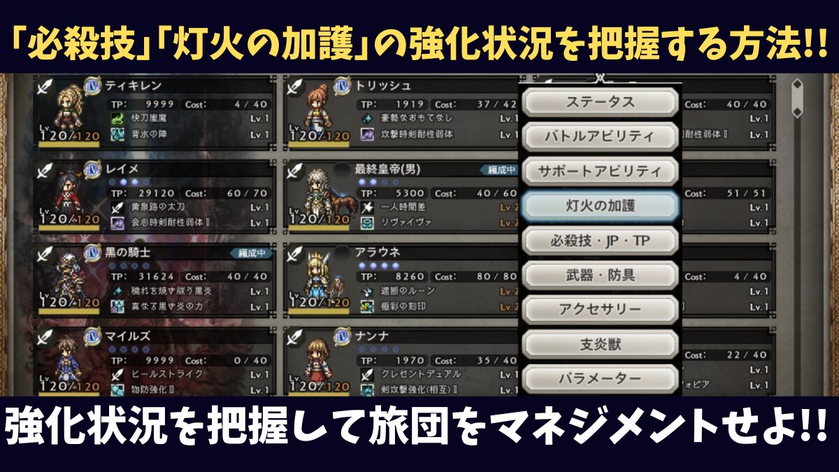 パーティ画面から全トラベラーを一覧表示し、強化状況の表示を切り替えて確認していく方法です