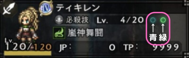 (画像のティキレンは、必殺凸済なので青が消灯、秘奥解放未なので緑の方が点灯しています)