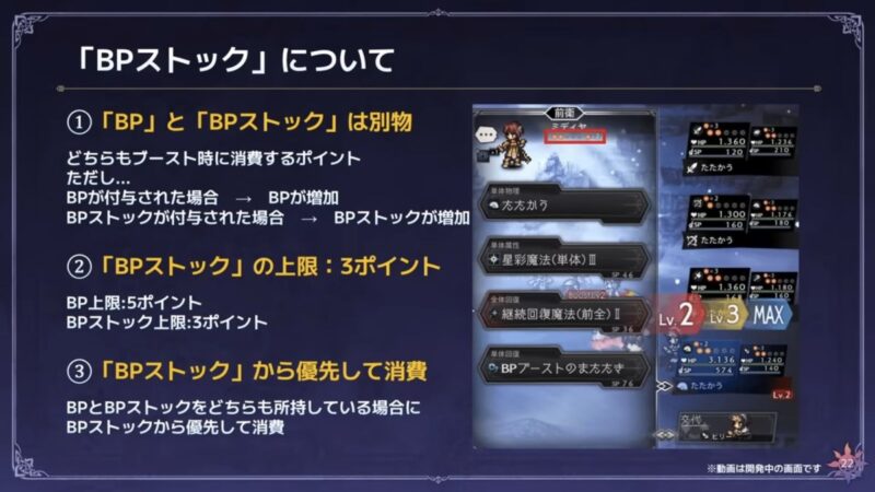 - BPとBPストックは別物で、「BPストックを付与する技、あるいは能力」でないと付与できない(自然回復では溜めていけない)