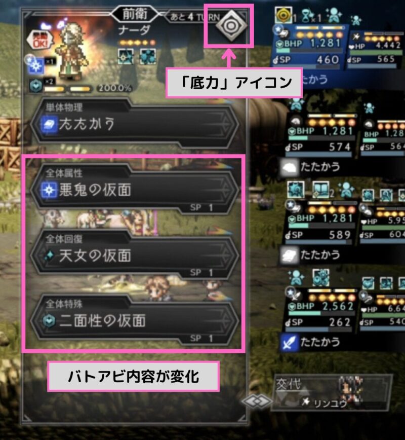 攻撃性能が超強力になるので、敵をブレイクさせる前のターンに底力を使っておきましょう
