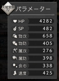 ステータスは、基本的にHP/SPや攻撃力が大事。キャラの素の攻撃力は、武器の攻撃力よりも大きくダメージに影響します