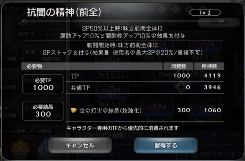 戦闘開始時に前衛全体にSPストックが付与されるので、ストーリー攻略や周回での雑魚敵戦によるSP消耗が気にならなくなり快適な旅ができるので、ぜひ強化してみてください!