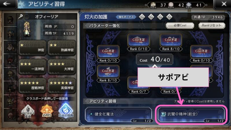 オフィーリアの灯火の加護で習得できる「サポアビ」をLv.1→Lv.2に強化することで、