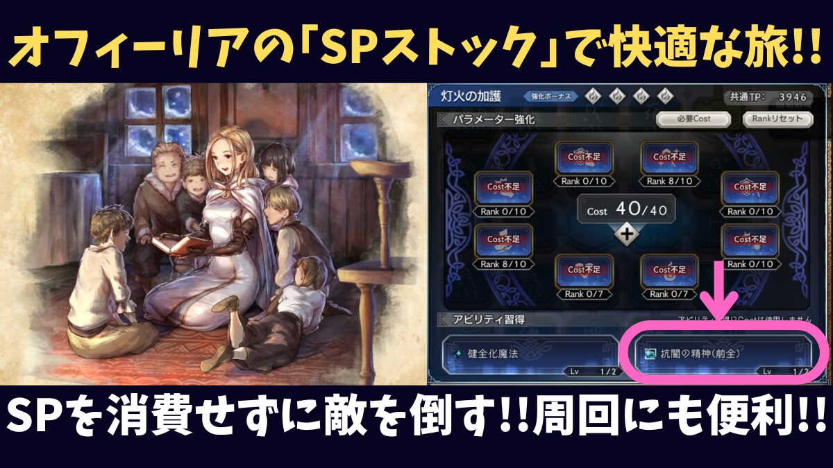 戦闘開始時に前衛全体にSPストックが付与されるので、ストーリー攻略や周回での雑魚敵戦によるSP消耗が気にならなくなり快適な旅ができるので、ぜひ強化してみてください!