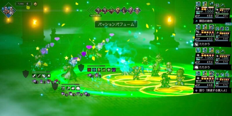 さらに、味方前後衛全体にBP回復量1アップの効果を付与(3ターン)