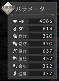 ステータスは、基本的にHP/SPや攻撃力が大事。キャラの素の攻撃力は、武器の攻撃力よりも大きくダメージに影響します