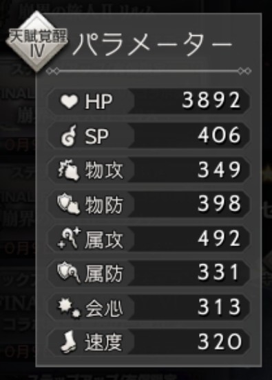 ステータスは、基本的にHP/SPや攻撃力が大事。キャラの素の攻撃力は、武器の攻撃力よりも大きくダメージに影響します