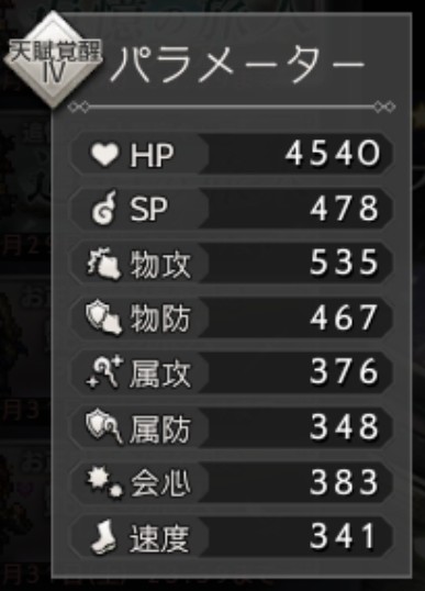 ステータスは、基本的にHP/SPや攻撃力が大事。キャラの素の攻撃力は、武器の攻撃力よりも大きくダメージに影響します