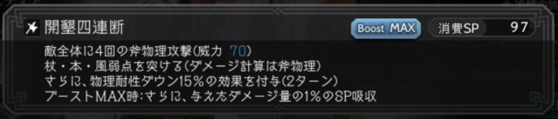敵単体に高威力の斧単発攻撃(杖/本/風 弱点突ける)をする技ですが、