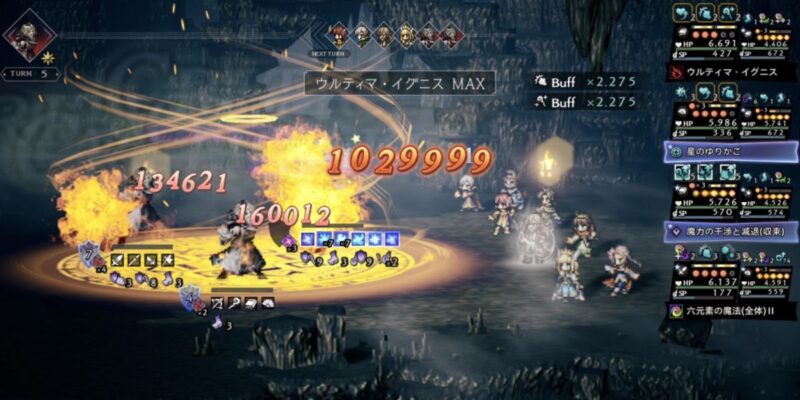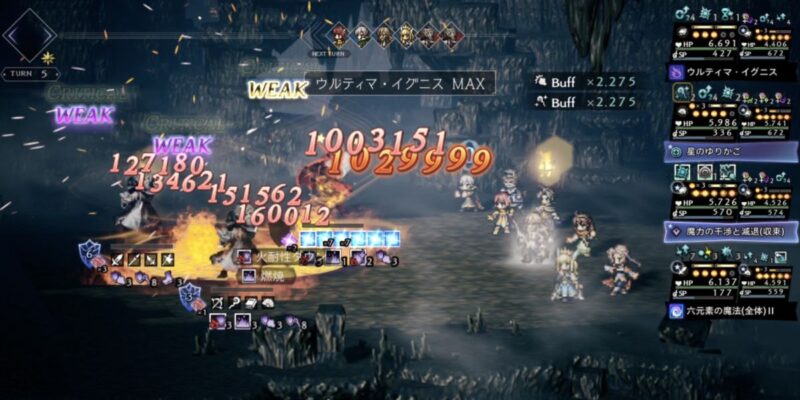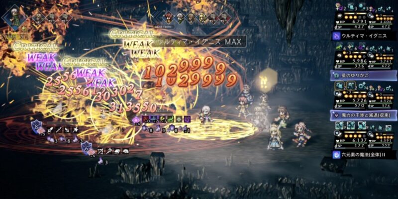 属性攻撃でクリティカルが発生+必ずクリティカルで、確実に火力をあげることができます(9ターン)