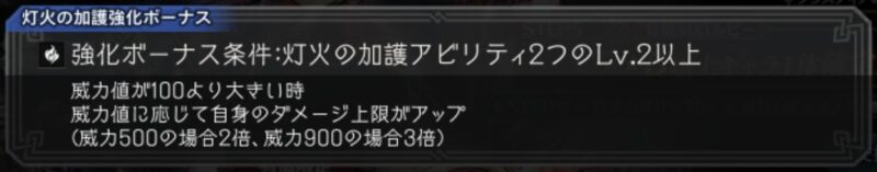 灯火の加護強化ボーナスで、技の威力値に応じたダメージ上限アップ補正が入るタイプのキャラです。高威力のバトアビ【ウルティマ・イグニス】に適応され、ダメージ上限が大きく伸ばせるので優先して習得しましょう