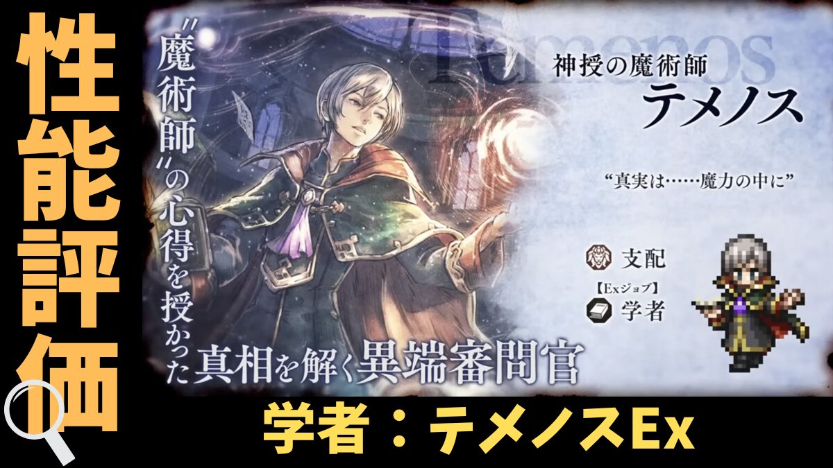 新規さんにはおすすめできるキャラで、テメノスEx自身の6属性突ける汎用性の高さに加え、味方が突ける弱点を増やせるので手持ちキャラも活かしやすくなります。自己バフである程度火力を盛れる分、バッファーが揃っていなくても火力を出しやすいところも重宝すると思います